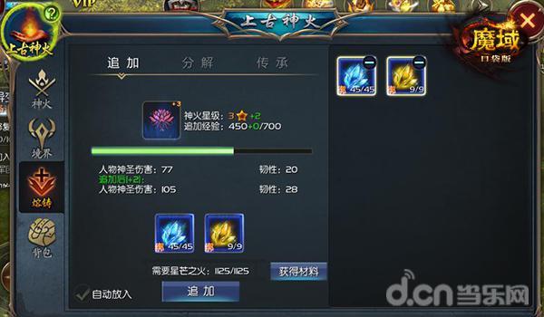 神火还有一点独特之处在于“变废为宝”,玩家在任务、打怪中获得多余的神火,可以用来分解为神火的养成材料,品质越好星级越高的神火所能分解出的材料越多。而通过这些养成材料则又能提升已有神火的实力,让玩家实力也获得进一步提升!