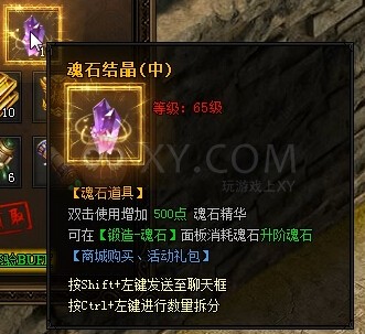 魂石结晶(中)。需要等级达到65级才能使用。道具类型属于魂石道具。双击使用增加500点魂石精华。可在[锻造-魂石]面板消耗魂石升阶魂石。获得方式是商城购买、活动礼包中也可以开得。