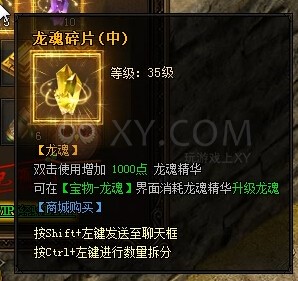 龙魂碎片(中)。等级需要达到35级才可使用。道具类型属于龙魂。双击使用增加1000点龙魂精华。可在[宝物-龙魂]界面消耗龙魂精华升级龙魂。获取方式方面,可在商城购买。